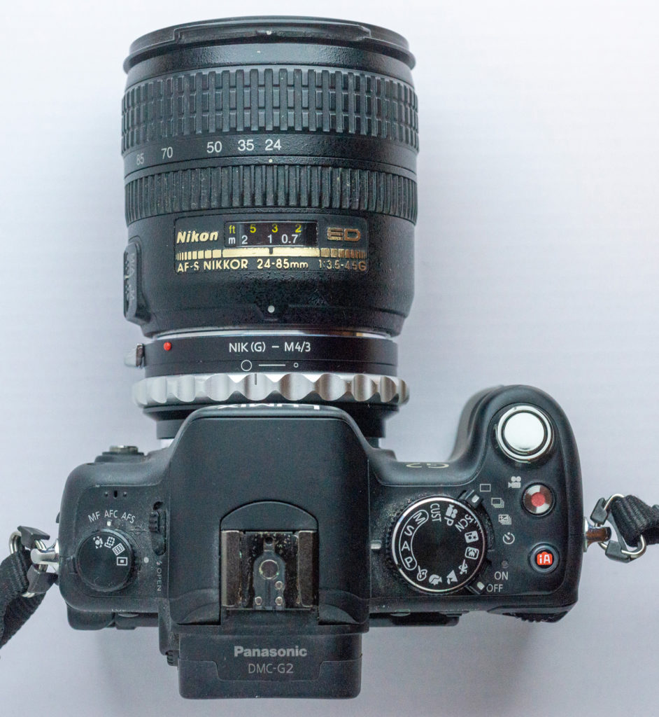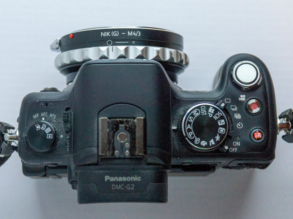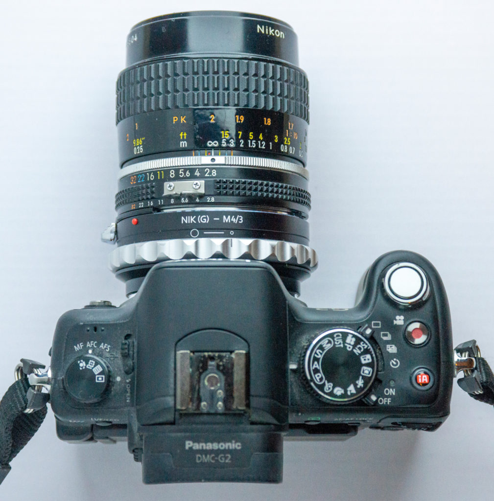 This time aperture is controlled via the ring on the lens adapter, moving from ‘NIK(G) to M4/3. Care is needed when using this method because the clicked stops are not as easy to feel, again take note of the indicator mark. NIK(G) is lens wide open M4/3 is fully stopped down.