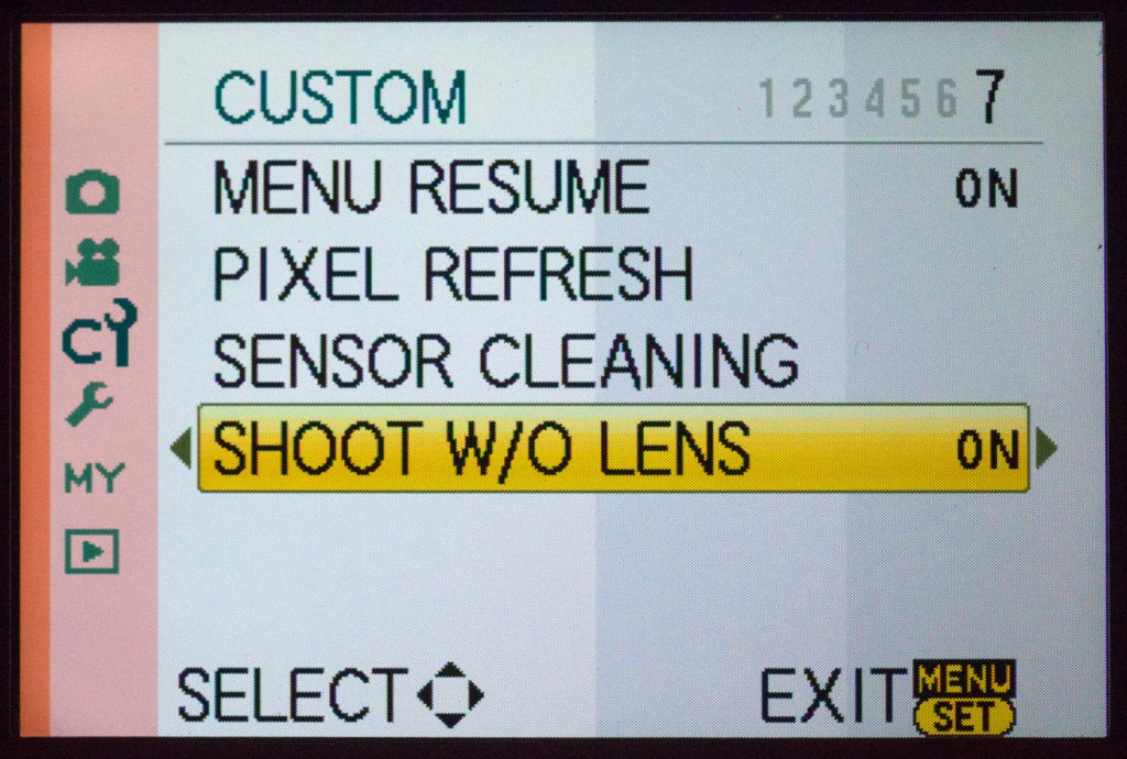 To start, go into the camera menu and select the ‘Shoot W/O lens’ option.